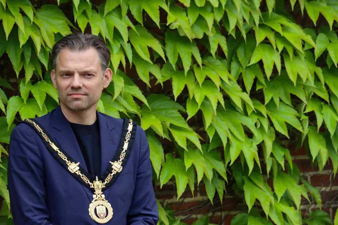 Borgmester Michael Vindfeldt (S) – der var iført borgmesterkæde mandag – glæder sig over mindepladen: