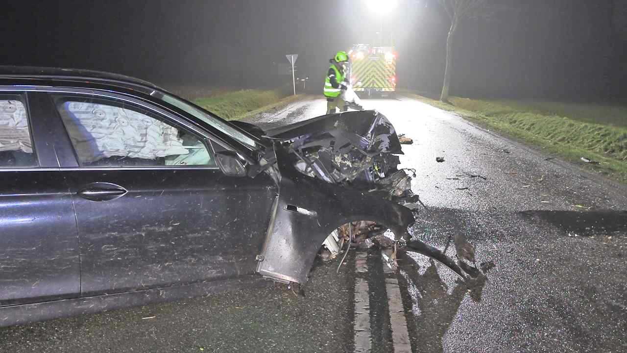 Af endnu ukendte årsager mistede føreren af BMW'en kontrollen over bilen som kom ud i rabatten og her påkørte et kraftigt træ som bla. rev højre forhjul af og sendte det ca. 30-40 meter ud på en mark.