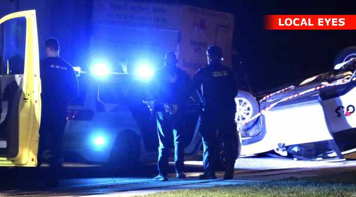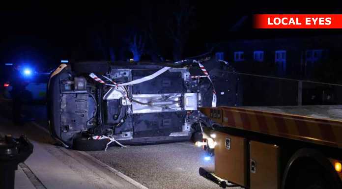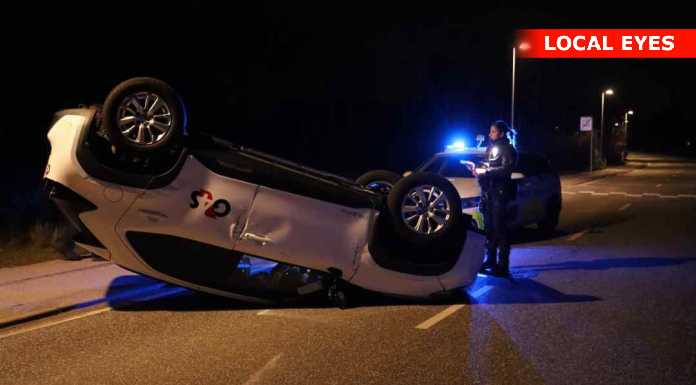 På stedet var politiet, da en vagtbil var forulykket og endt på taget.