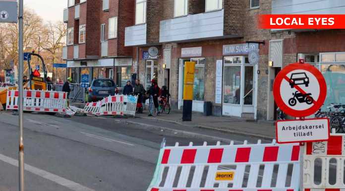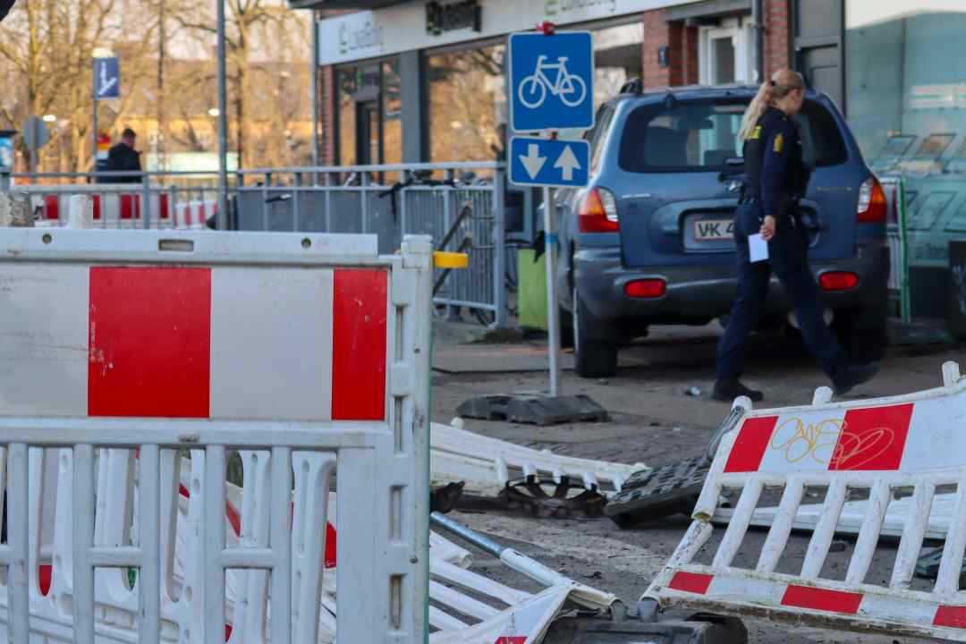 En stor bil er øjensynligt pløjet igennem 2 afspærringer ind til et vejarbejde og ind i et rækværk til Svanemøllen Stations gangtunnel på Sibeliusgade på Østerbro.