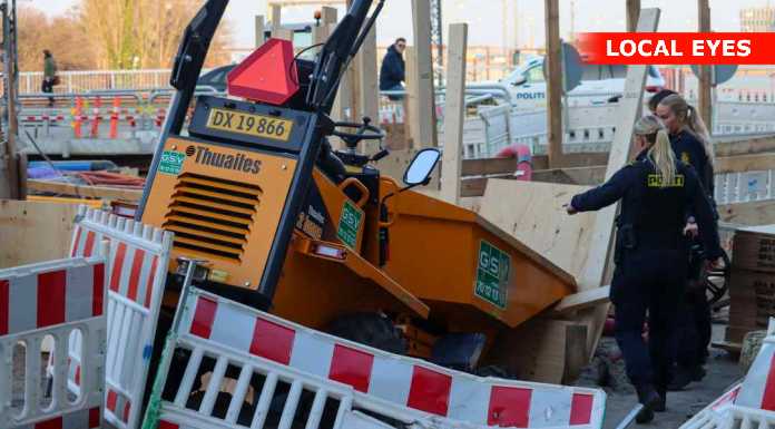 En dumper er blevet skubbet ned i et hul, af bilen – og en del vejarbejde-materiel er ødelagt.