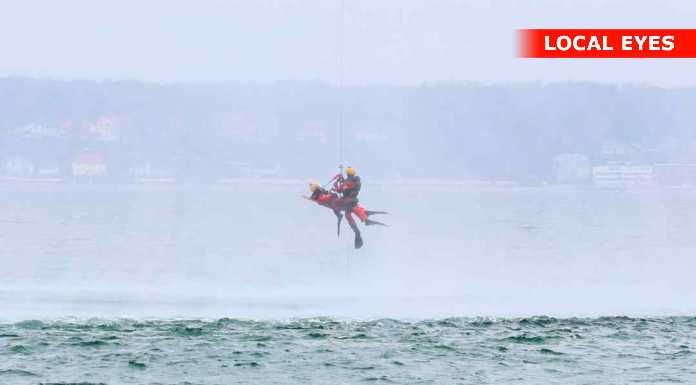 Mange lå i spa'en og kunne kigge på mens rednings svømmeren fra helikopteren blev firet ned i vandet.