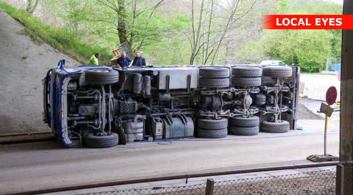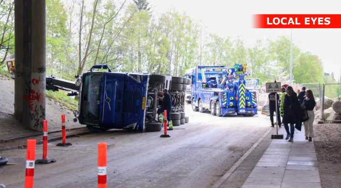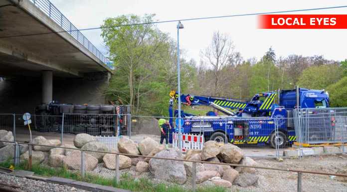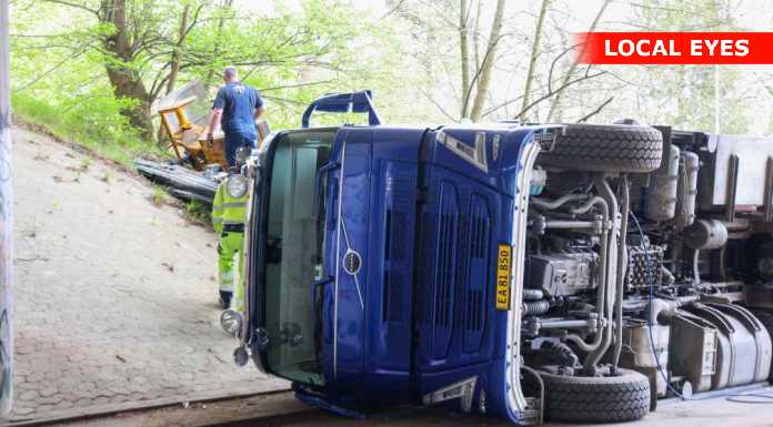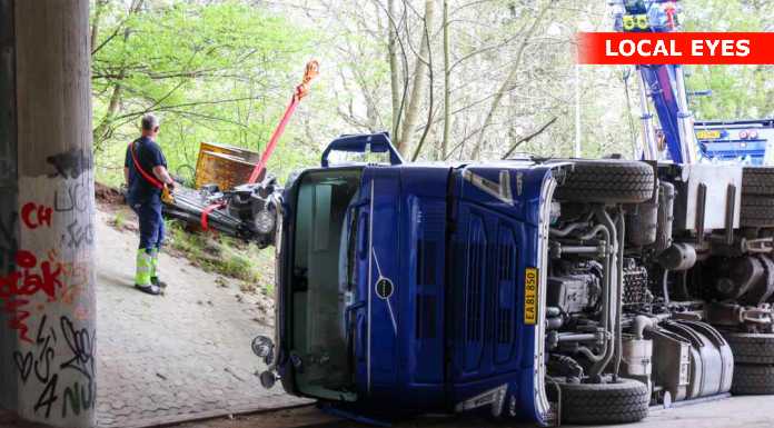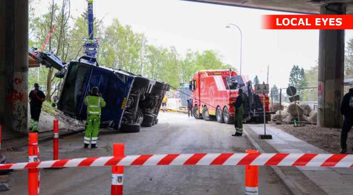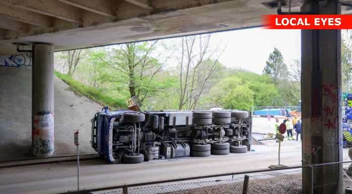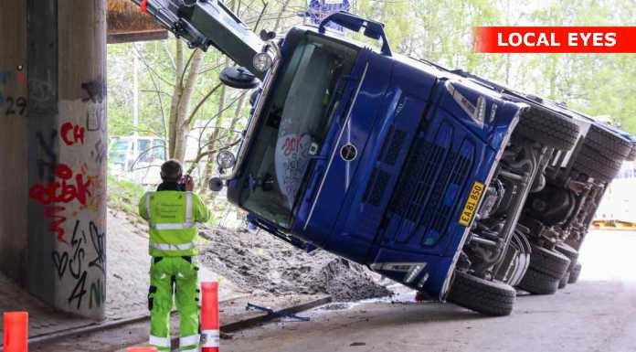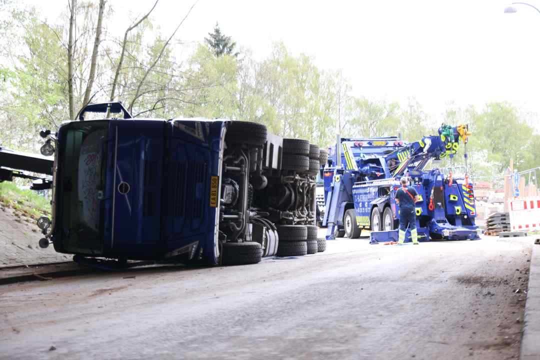 BAGSVÆRD: En lastbilchauffør har mandag eftermiddag påkørt motorvejsbroen over Skovbrynet Station, og er i den forbindelse væltet om på siden.