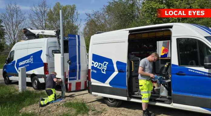 Teknikerne var i fuld gang med at opsætte et advarselssystem som netop skal advare mod den lave bro, som er 2.5 m høj.