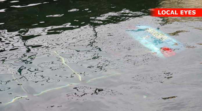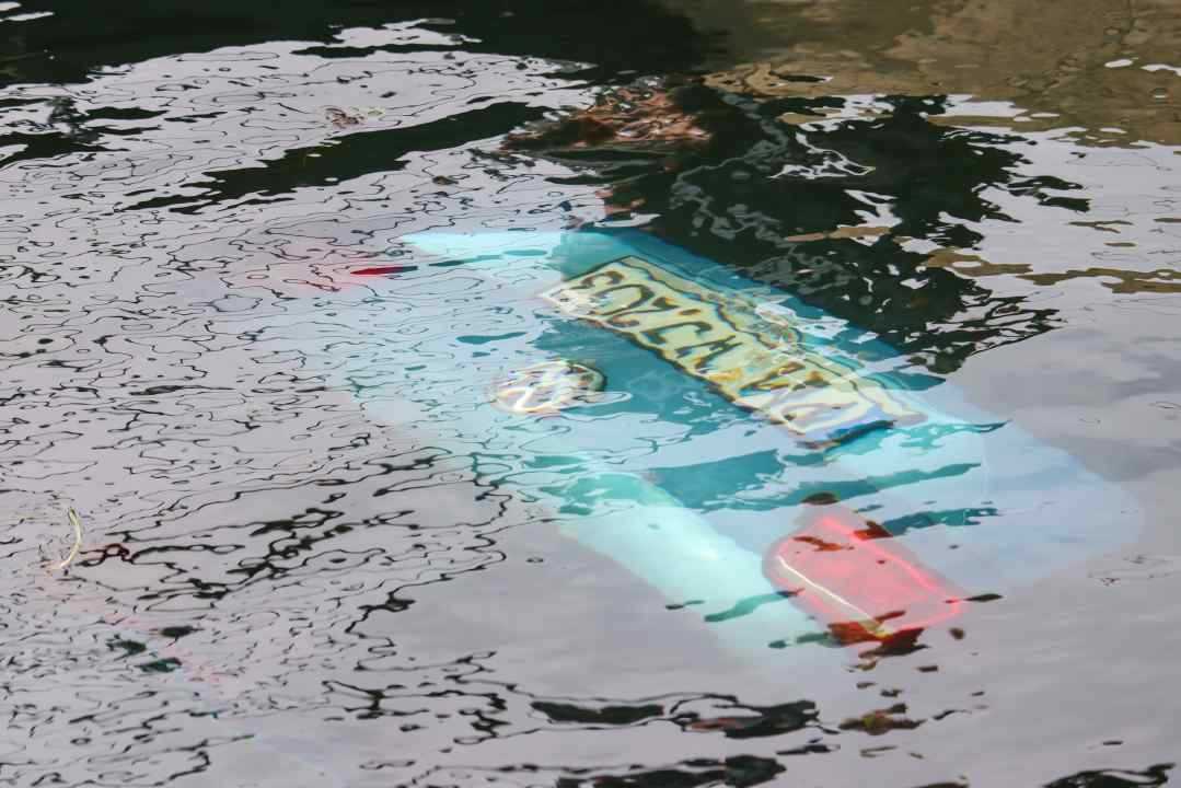 En VW-personbil, med tysk nummerplade, ligger nede i vandet, ved en gangbro ud til Københavns Havn, cirka 100 meter i vestlig retning fra Knippelsbro.