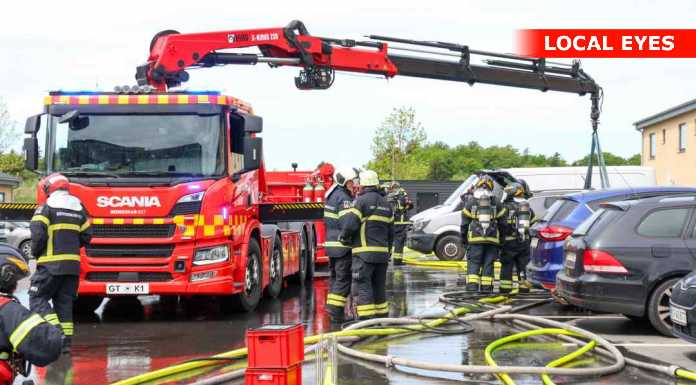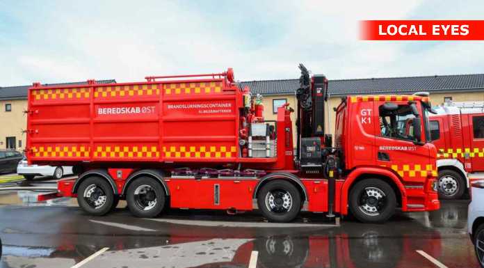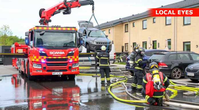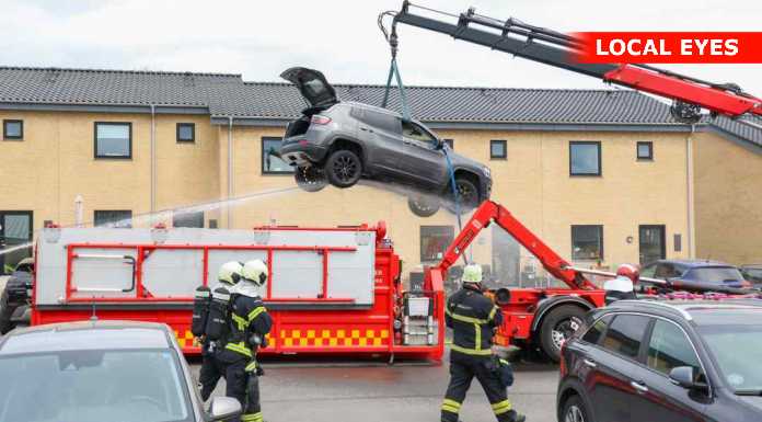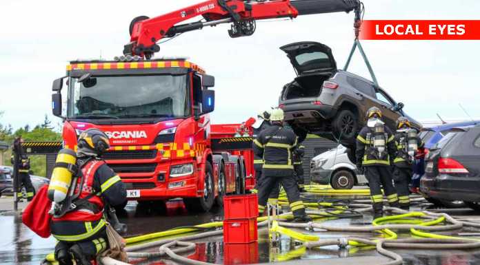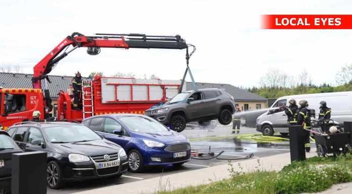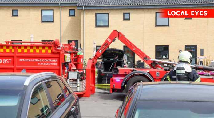 Beredskab Øst blev tilkaldt med deres container til at nedsænke el- og hybridbiler i, så de kan stå nedsænket i vand i 48 timer for at undgå at branden blusser op igen.