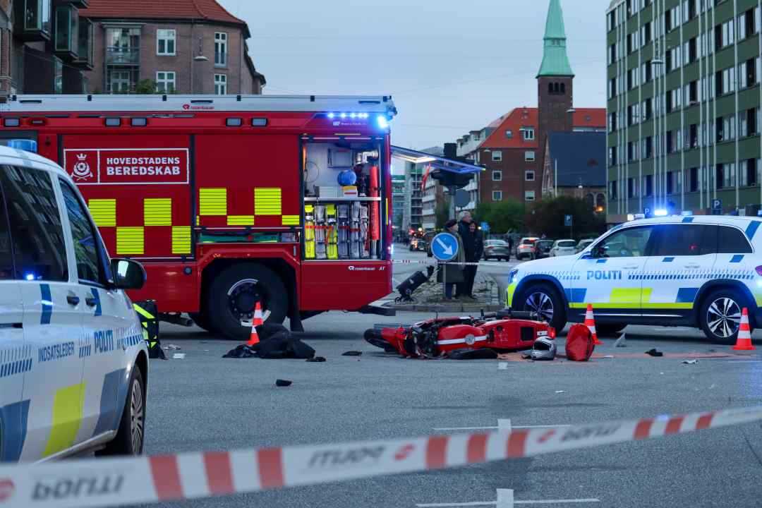 -Politi og redning er torsdag aften til stede i krydset mellem Østerbrogade og Jagtvej på Østerbro i København, hvor en motorcykel og en brandbil har været involveret i et uheld.