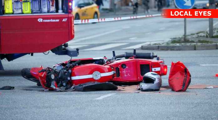 Midt i krydset ligger også en motorcykel. Ligesom den øjensynligt implicerede brandbil (motorsprøjte) holder i krydset.