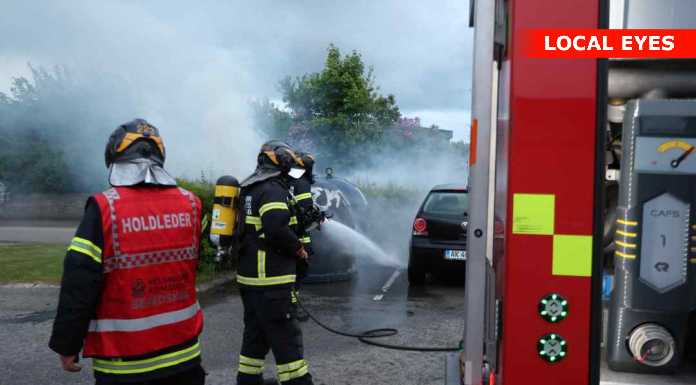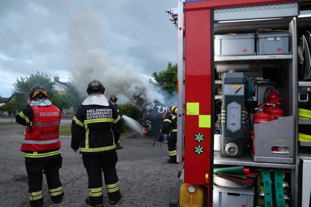 Beredskabet har nu fået slukket branden, mens Nordsjællands Politi kigger på de biler der har holdt tæt på om der er sket skade.