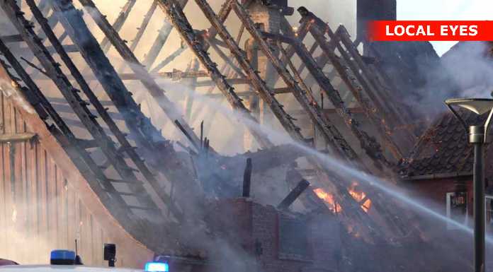 2 skorstene styrtede sammen og tog gavlen med sig i faldet. Røgfanen kunne ses i store dele af byen.