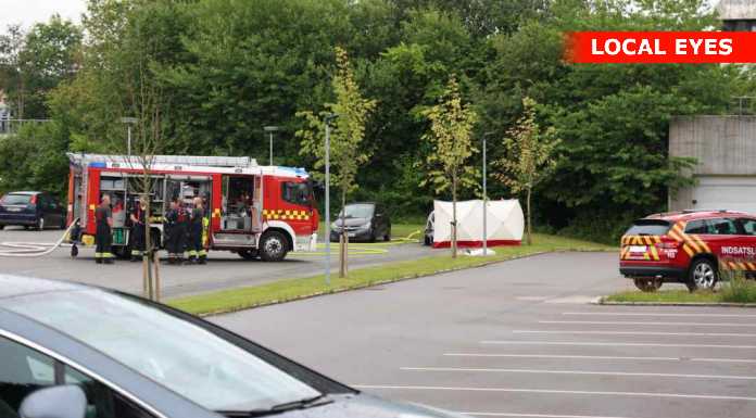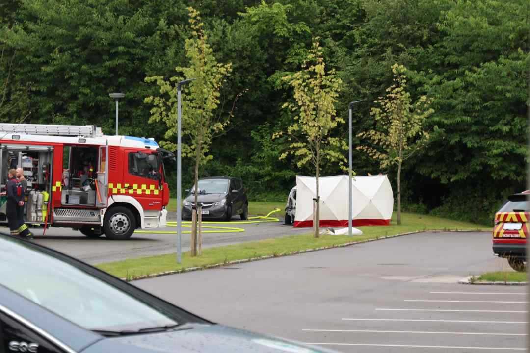 Branden er nu slukket og der er sat afspærringsskærm op omkring bilen.