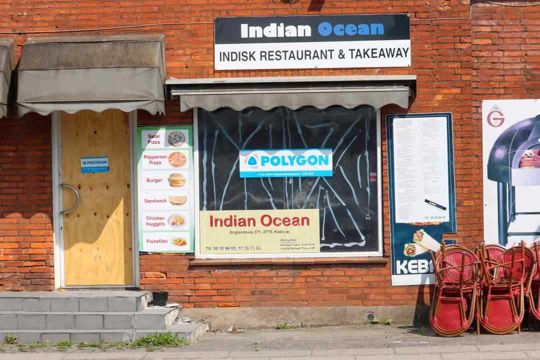 Restauranten Indian Ocean på Englandsvej 371 i Kastrup fremstår brandskadet torsdag eftermiddag, og der står brandskadet inventar udenfor, på den ene side af bygningen.