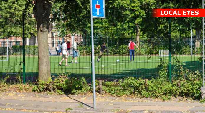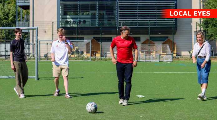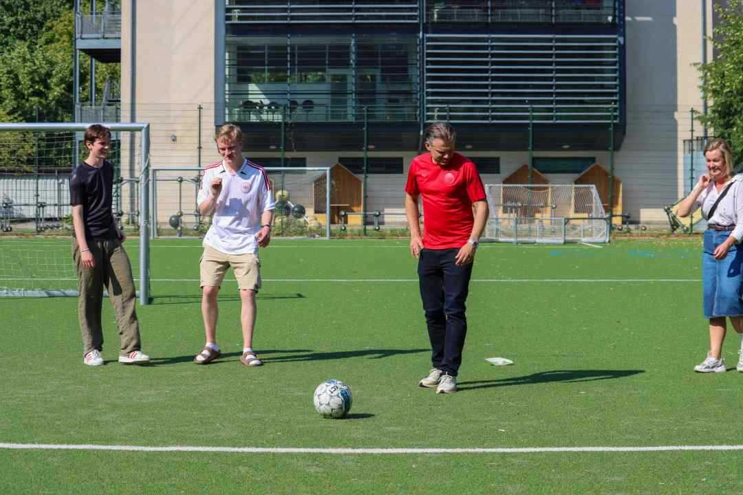 Dermed kunne nogle lokale, heriblandt Frederiksbergs borgmester (i rød landsholdstrøje), spille fodbold på folkeskolens boldbane.