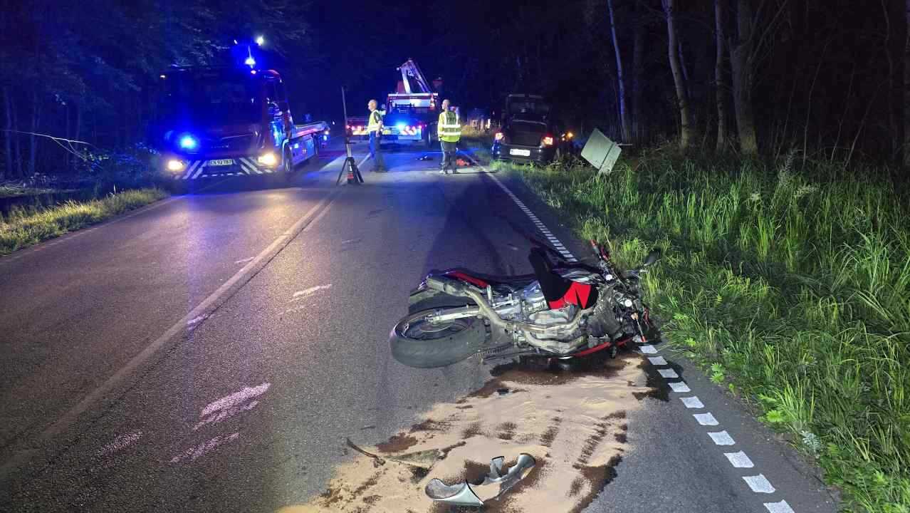 Den 42-årige motorcyklist skal have kørt bag en bil, da en modkørende bil pludselig trækker over i den modsatte vognbane i et mindre sving.