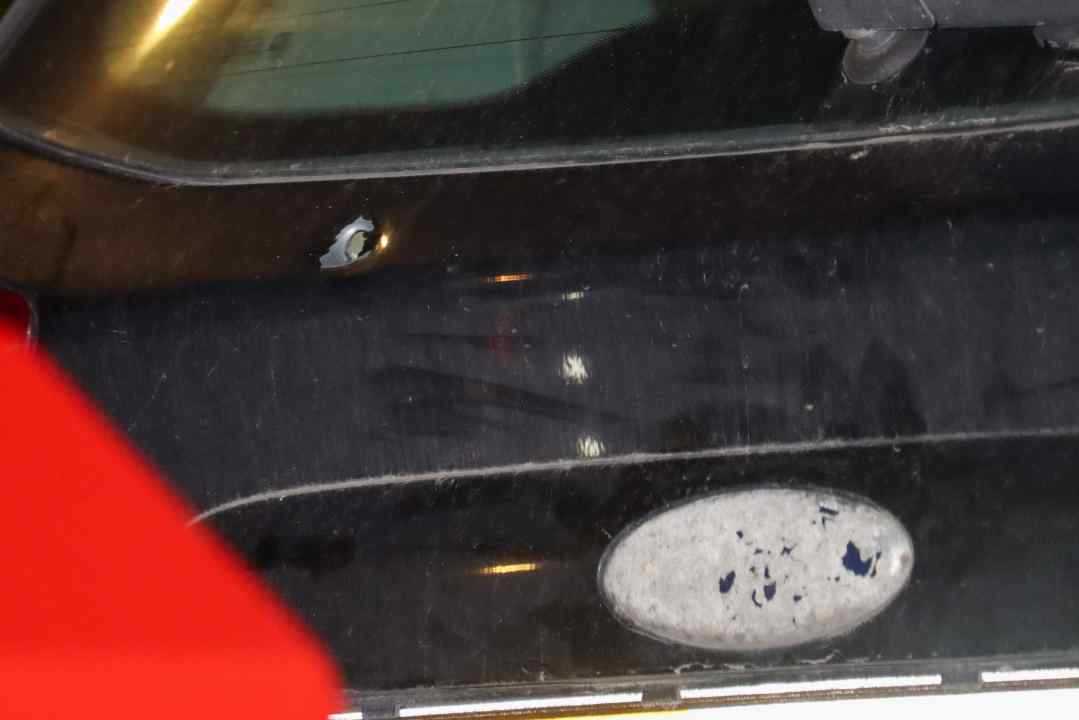 En sort bil med skudhuller i bagenden – og en stor skade på forruden og en siderude – holdt på Liljevej i Gentofte, indtil bilen blev afhentet af et fejeblad, der øjensynligt var rekvireret af politiet, omkring kl. 22:45 fredag aften.