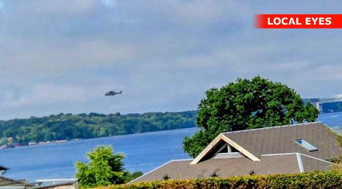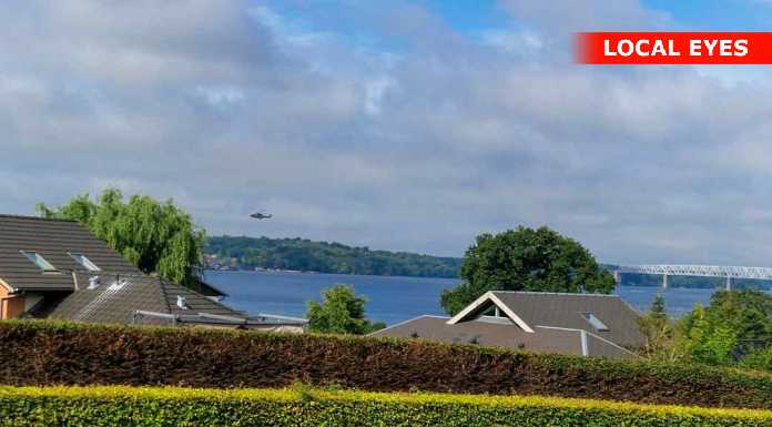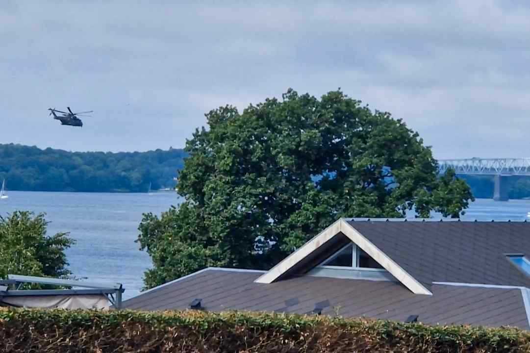 Omkring kl. 10:30 lørdag flyver en stor redninghelikopter over Lillebælt. Det sker efter en melding om en drukneulykke.