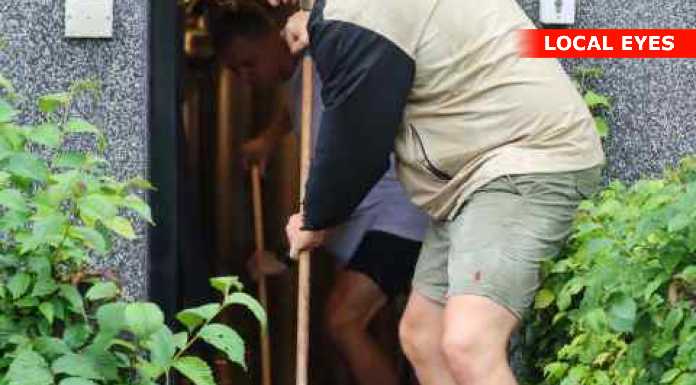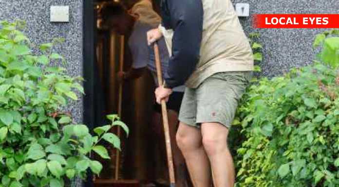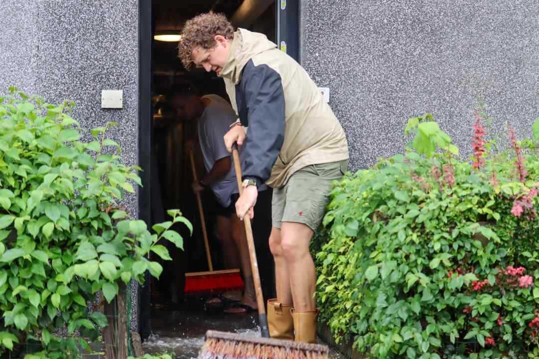 Et par beboere forsøger, kort efter kl. 15:00, at feje vand ud ad kælderen og ud på Dalgas Boulevard.