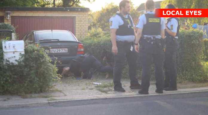 Ved Localeyes’ fotografs ankomst lå manden i håndjern i en indkørsel, mens han råbte og truede politiet med voldsomme og provokerende udtalelser.