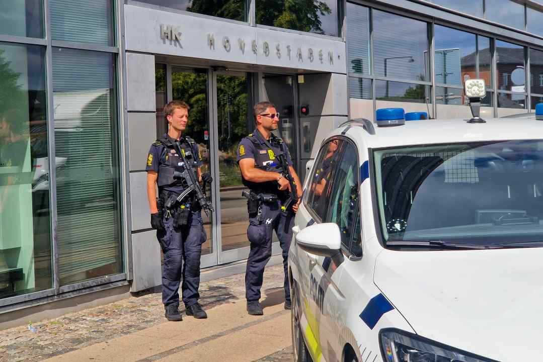 Politibetjente, med MP5-maskinpistoler, er til stede foran HK Hovedstaden på Amager kort efter omkring kl. 14:15.