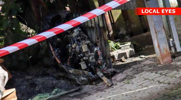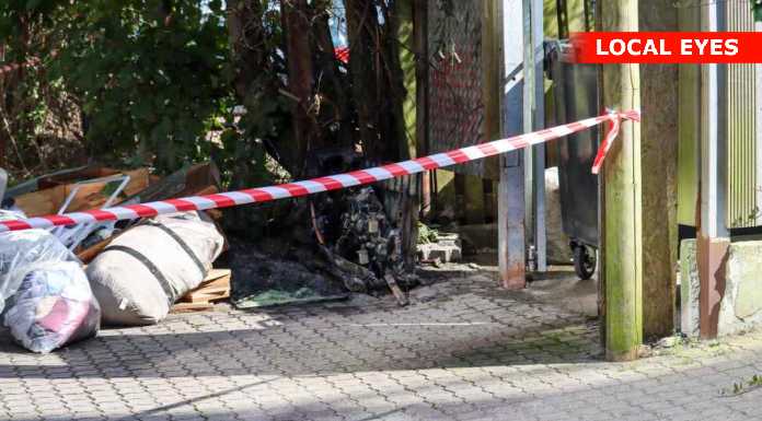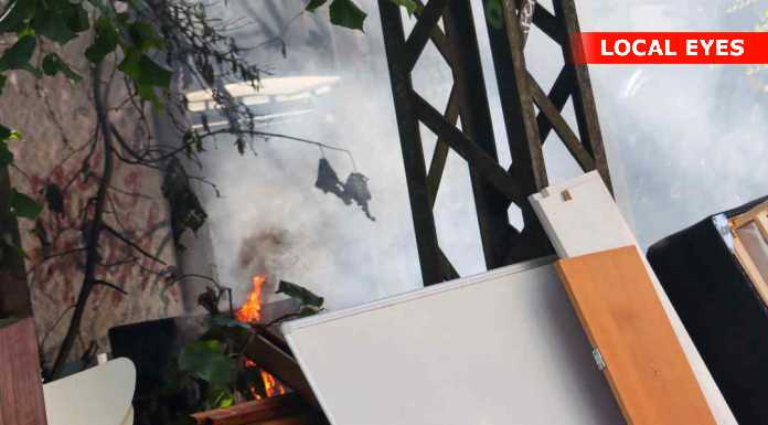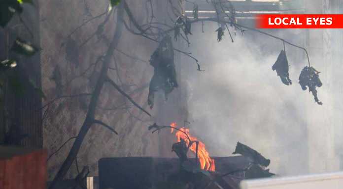 Politiet på stedet advarer om giftig røg. Og røgen lugter meget grimt og giver umiddelbart ubehag.