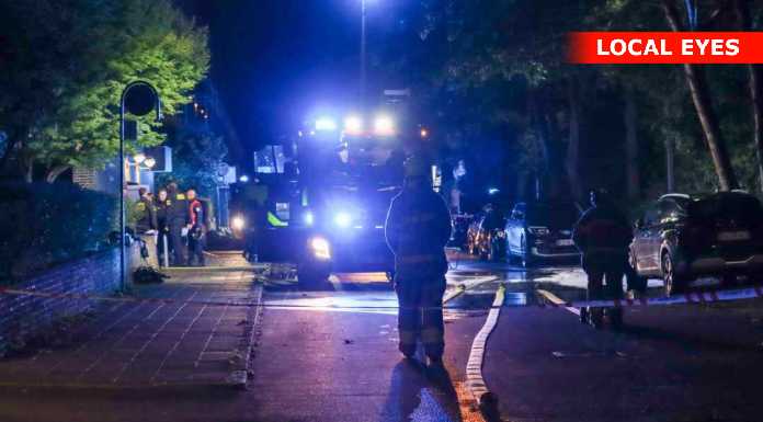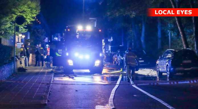 En afdød person ligger kl. 03:50 bag en opsat skærm på græsplænen foran en brand-ramt beboelsesejendom – og der er blevet opstillet en båre fra en såkaldt rustambulance (bil til transport af omkomne) fra Beredskabet foran skærmen.