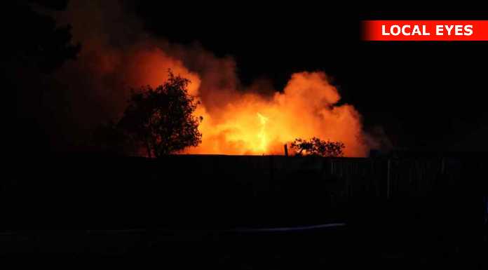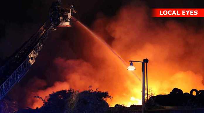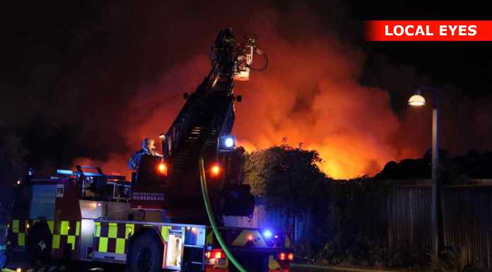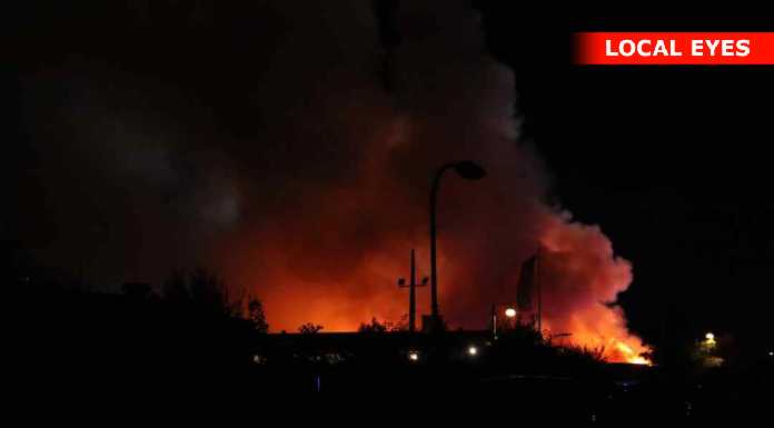 Det viste sig at være en voldsom brand i en stor mængde affald, hvor et rødt skær og røgudvikling kunne ses nogle kilometer væk.