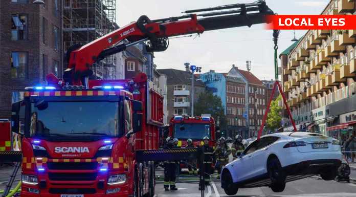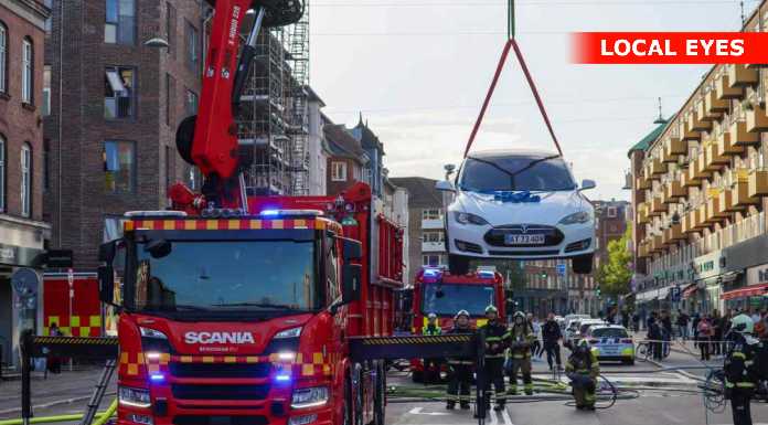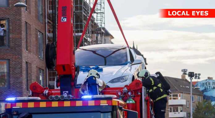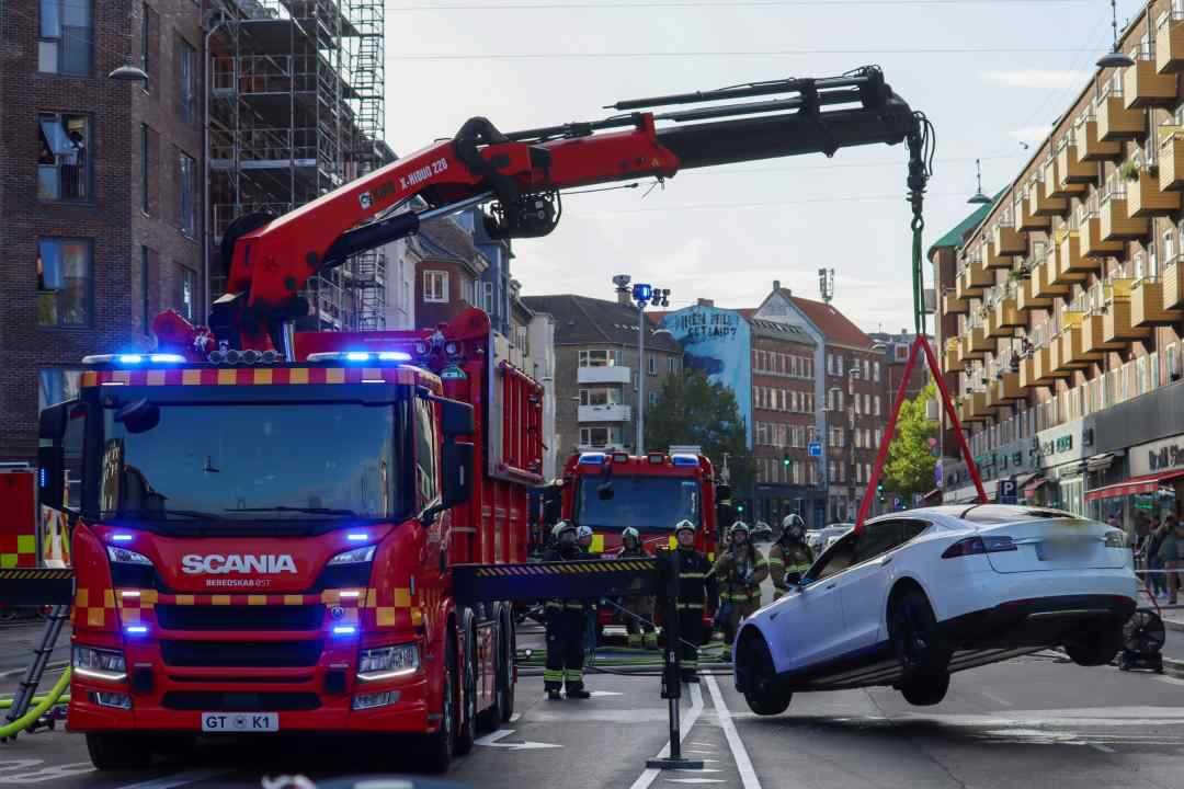 Tesla-brand på Frederikssundsvej ved Nørrebro Station: Tesla løftes i container med vand: