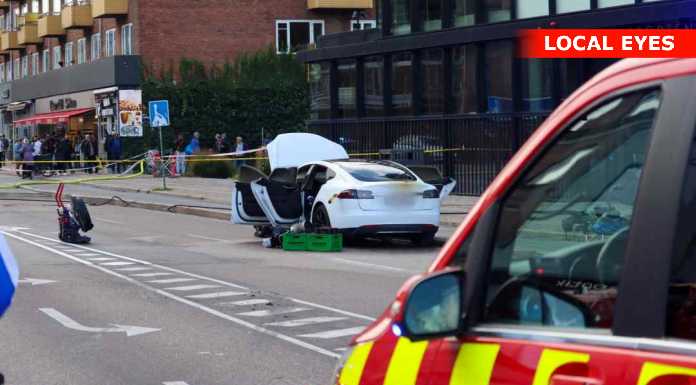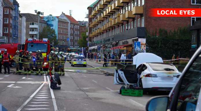 Brandvæsen og politi er talstærkt fremme – og Frederikssundsvej er helt afspærret omkring en hvid Tesla Model S fra 2015.