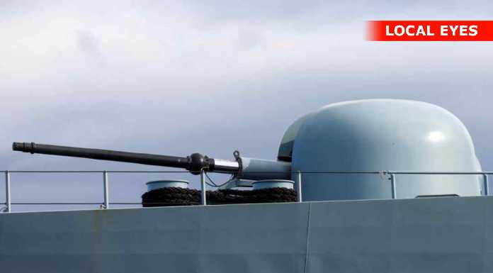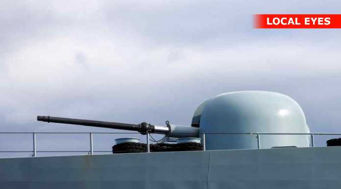 Og der ses kanon og andet forsvarsmateriel på skibet.