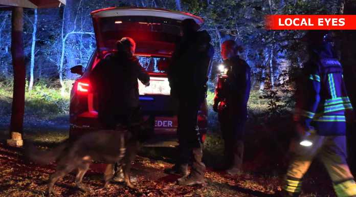 Hundepatruljer er indsat på brandstedet, for at søge efter eventuelt tilskadekomne som kan ligge i området, som er kraftigtog tæt bevokset med træer, buske og højt græs.