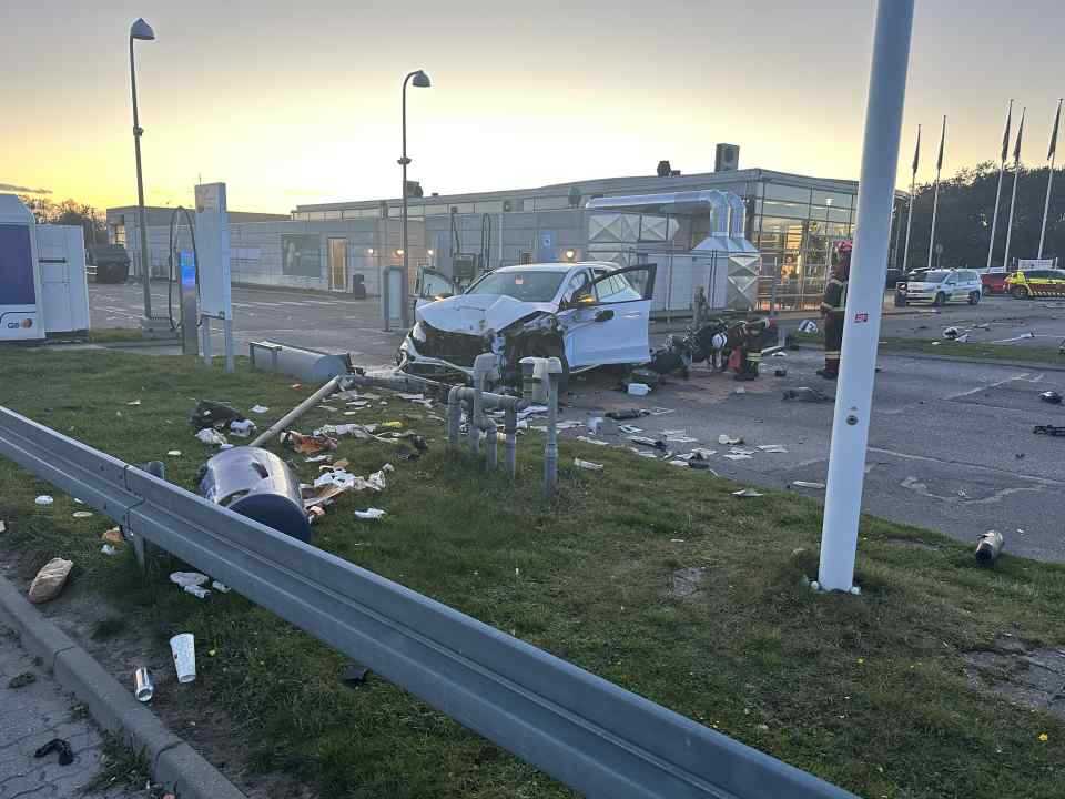 En bil kørte lørdag aften ind over et tankanlæg i Korsør. I forbindelse med ulykken ramte bilen en parkeret motorcykel og forårsagede skade på flere lygter og skraldespande på området.
