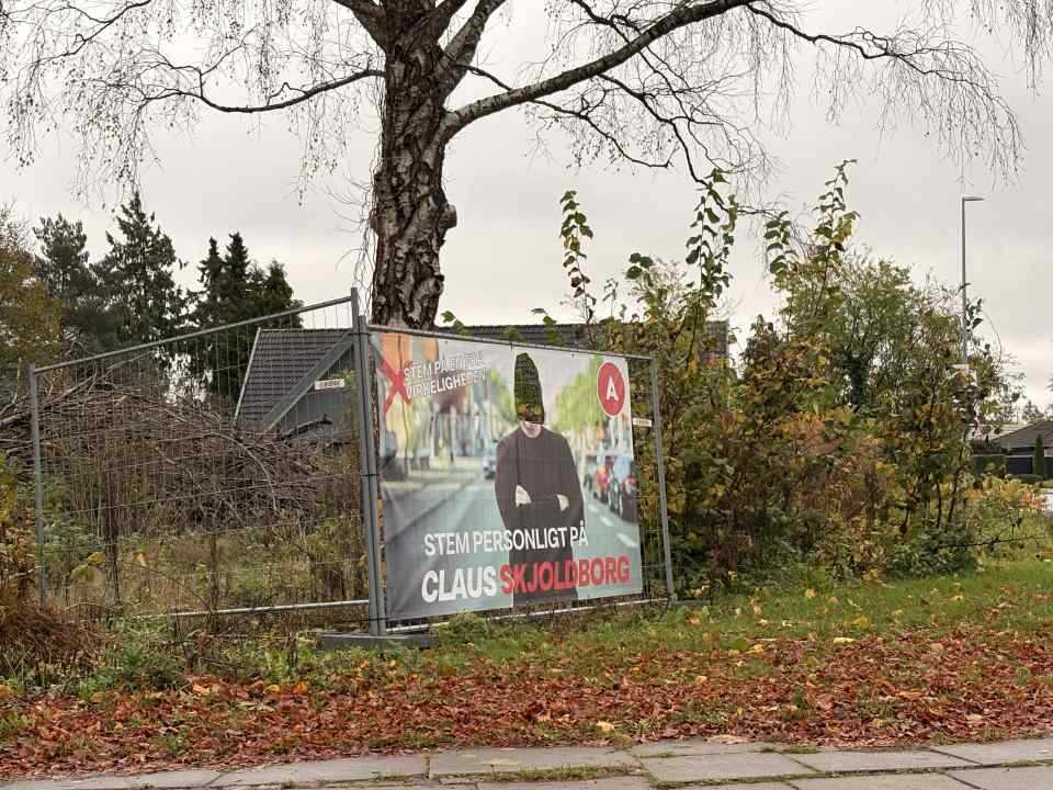 Den store plakat med teksten “Stem personligt på Claus Skjoldborg” bærer tydelige spor af ødelæggelse.