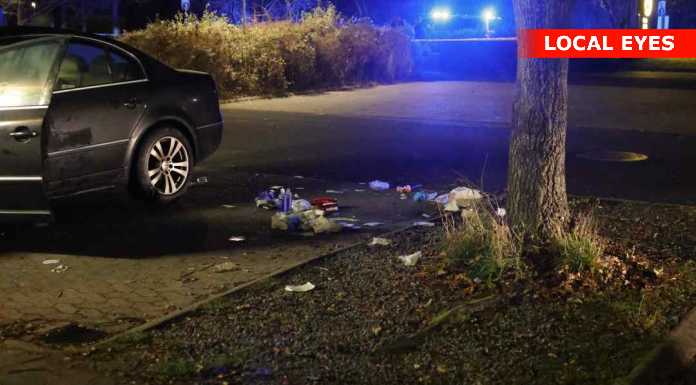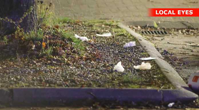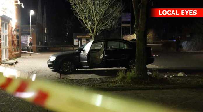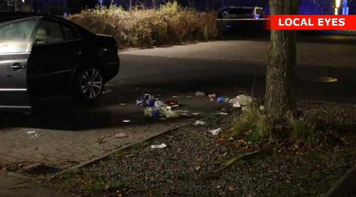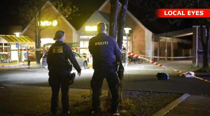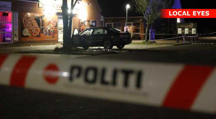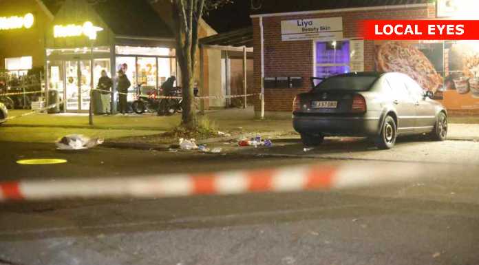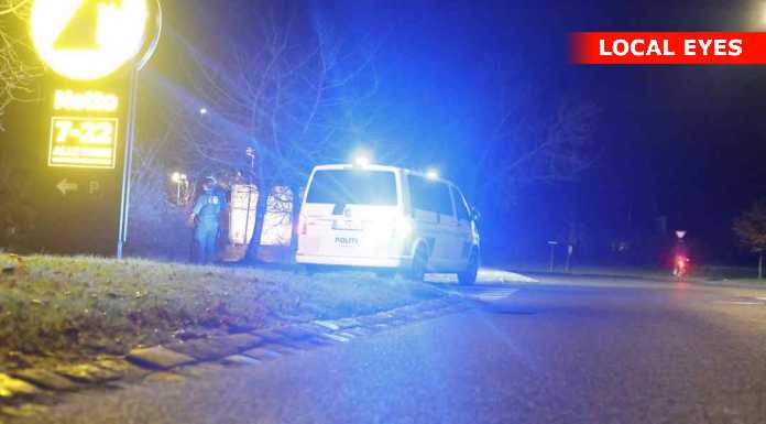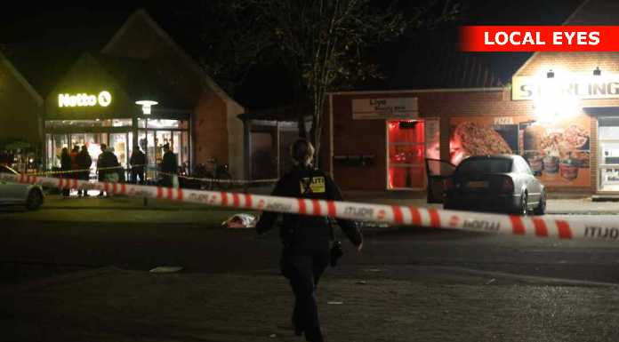 Der var tydelige blodspor, som strakte sig fra Netto og videre ud mod parkeringspladsen, mens betjente sikrede spor og talte med vidner.