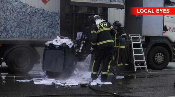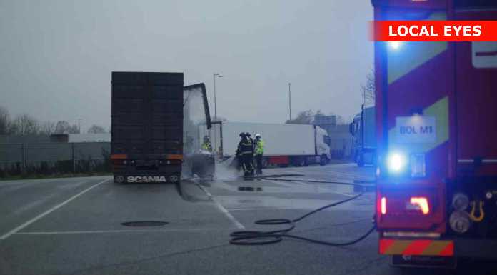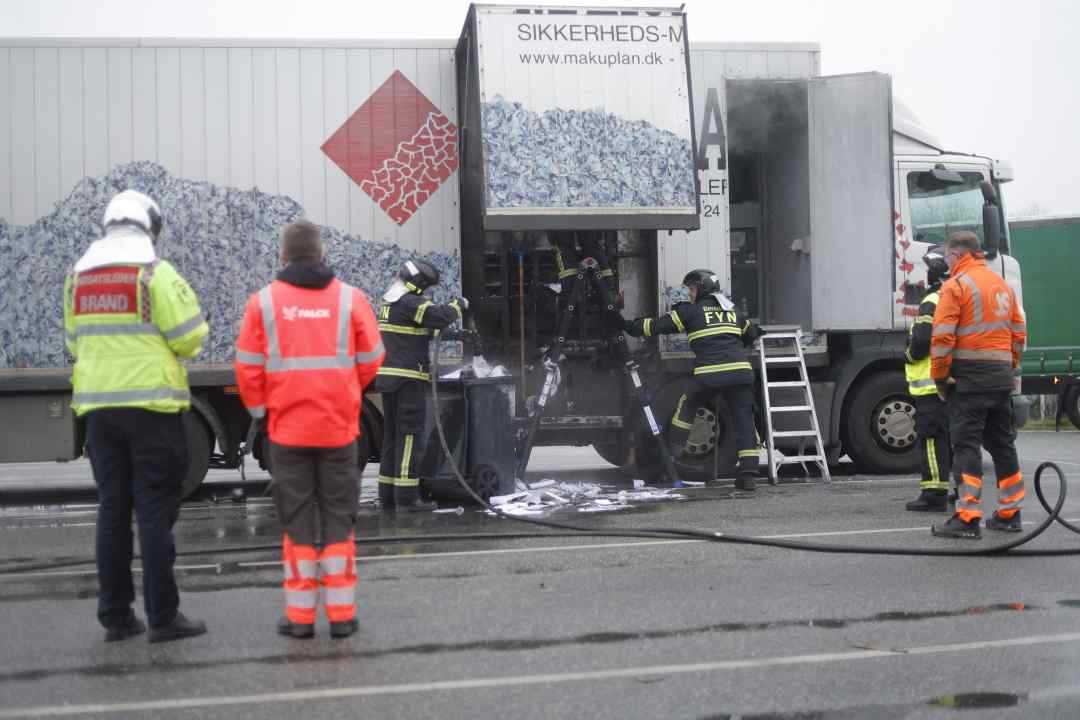 Da fotografen ankom, stod der ingen synlige flammer, men tydelig røg kom fra lasten, som bestod af skrald. Det er ikke tale om en skraldebil, men en almindelig lastbil med affaldslæs.