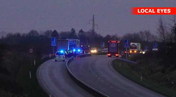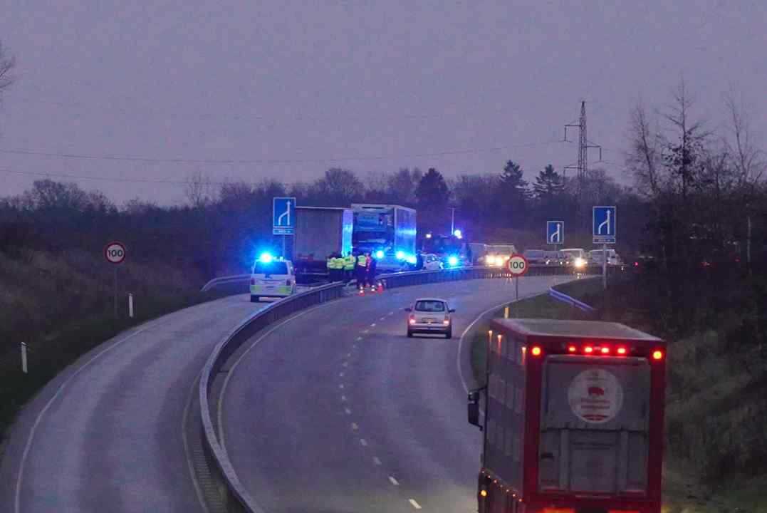 En lastbil er af ukendt årsag kørt gennem autoværnet og holder i modsatte spor torsdag aften. Politi er på stedet og vejen er helt spærret fra Næstved NØ og Næstved N på ubestemt tid. Politi har meld ud at der ikke er personskade.