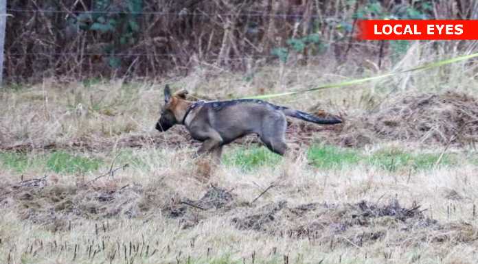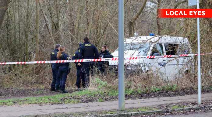 Politiet er fremme med mindst 5 køretøjer, og Beredskabsstyrelsen med 2 køretøjer. Der ses mindst 5 politihunde i området.