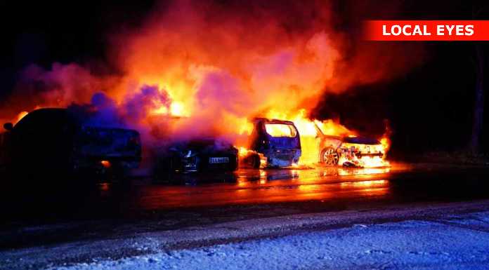 Fire biler udbrænder ved Dianalund. Man mistænker påsat brand
