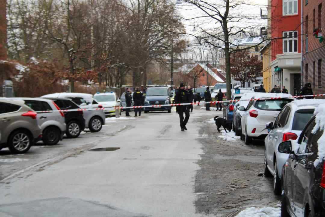 Der søges bl.a. med politihunde på Guldbergsgade – og et stort stykke af Guldbergsgade er afspærret.