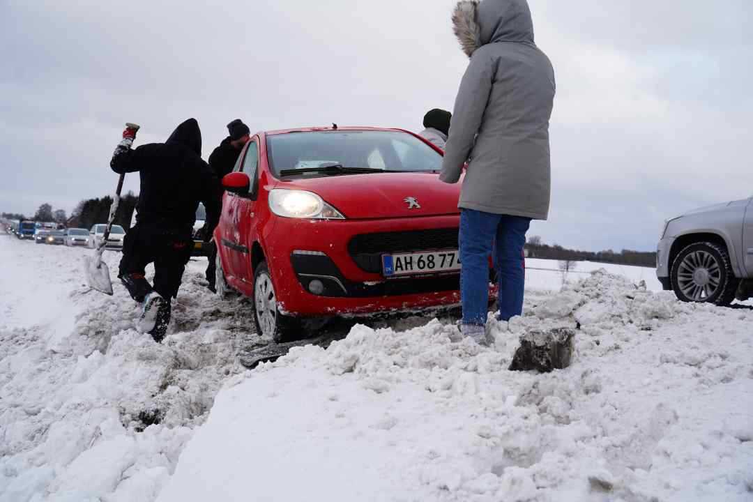 Ringsted : på rute 14 imellem Høm og Vetterslev fyr sneen kraftigt hen over vejen på åbne steder og det ligger sig på vej og cykelstier så det er svært fremkommelig. En bilist i en mindre bil sad fast i sneen og kunne ikke komme fri. I bilen befandt sig en lille familie bestående af to voksne og et par børn. Fotografen fra Local eyes ville give en hjælpende hånd men bilen sad fast. Et par gutter i en større kassevogn trådte til , standsede bilen midt på vejen tog et par skovle og fik gravet bilen fri og vi fik den op på vejen igen. Et par bilister var så utolmodig at de svinene de folk til der hjalp men han fik dog svar på tiltale . Imens andre holdt tilbage så den lille bil kunne komme op og videre.
