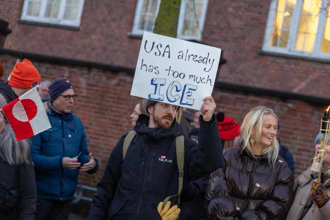 In front of the embassy, those present carried Greenlandic flags and signs, one of which read "USA already has too much ICE"