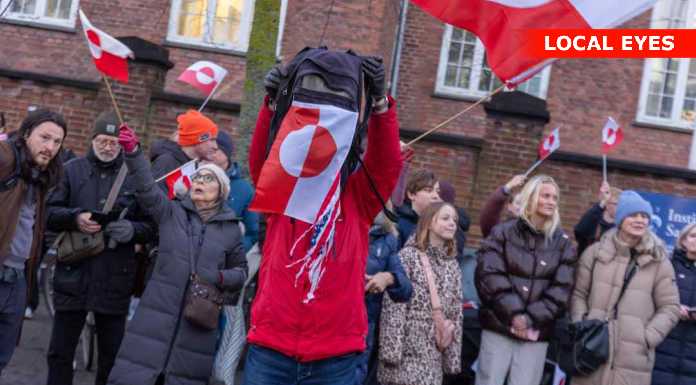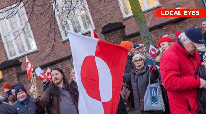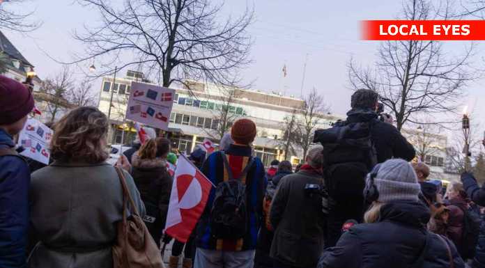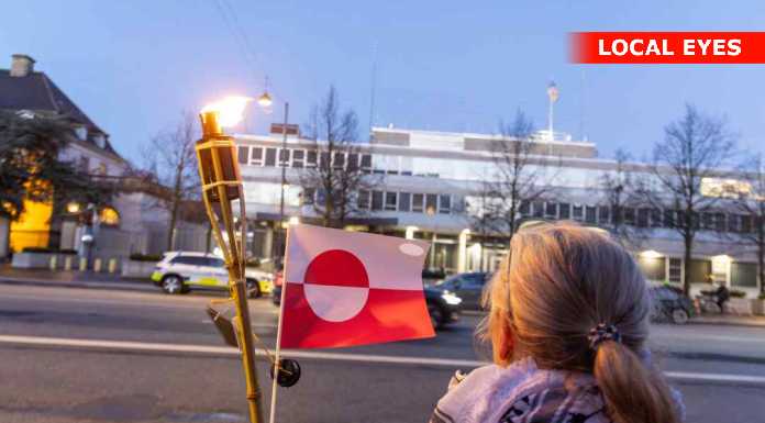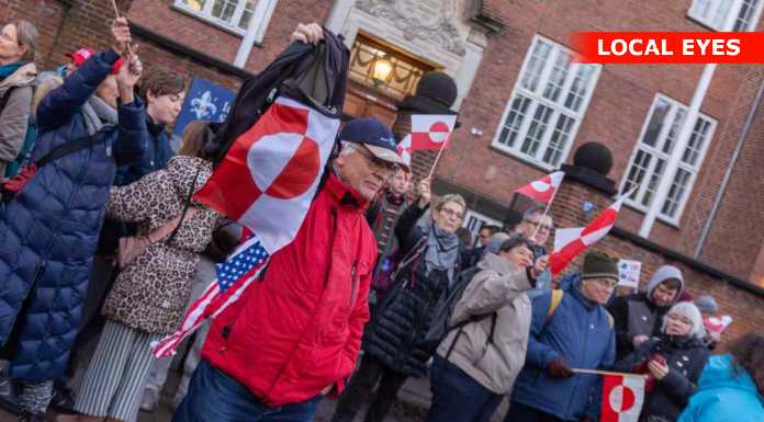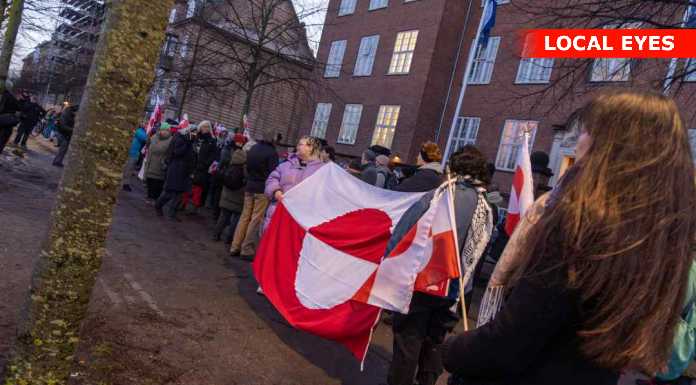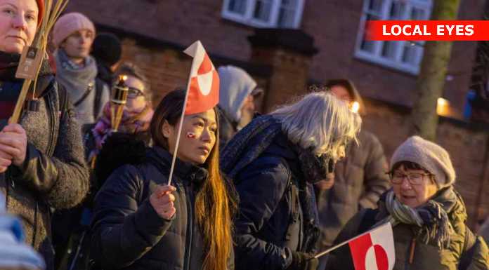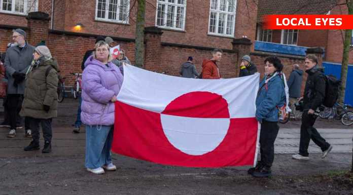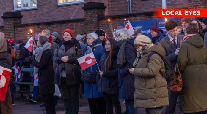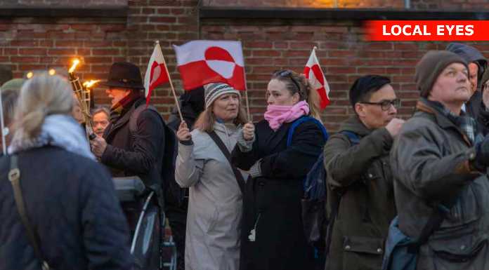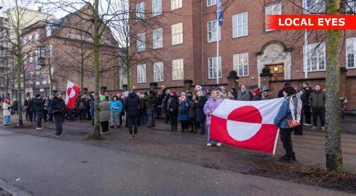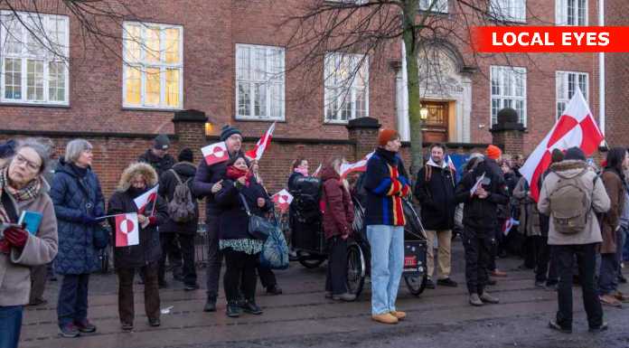 COPENHAGEN: At 4:00 PM, a large crowd gathered in front of the American Embassy in Copenhagen, ahead of the meeting between Danish Foreign Minister Lars Løkke Rasmussen and Greenlandic Vivian Motzfeldt.
