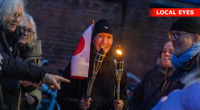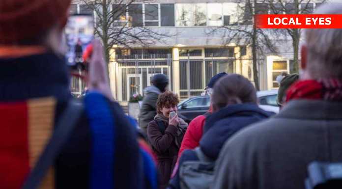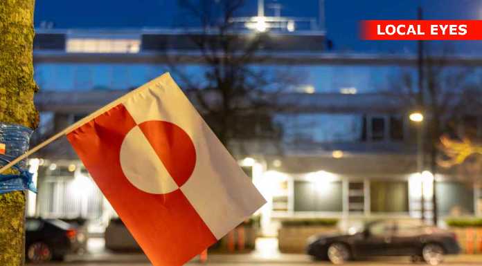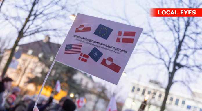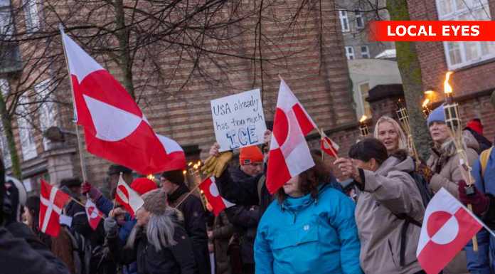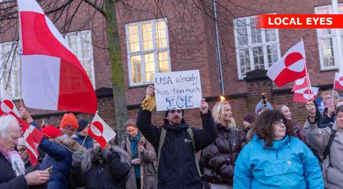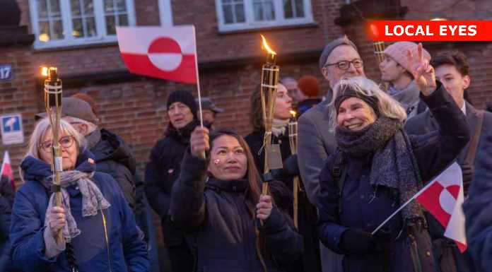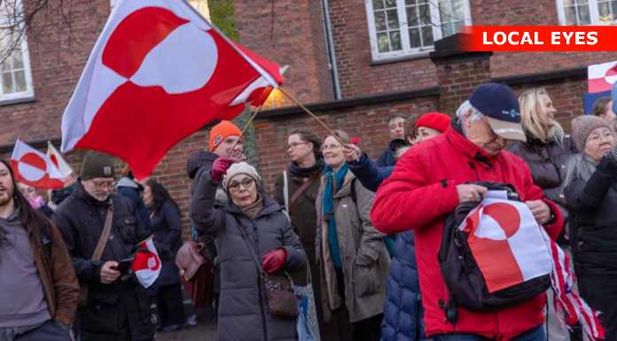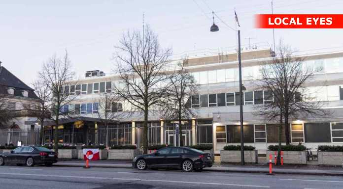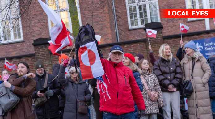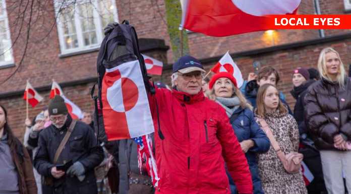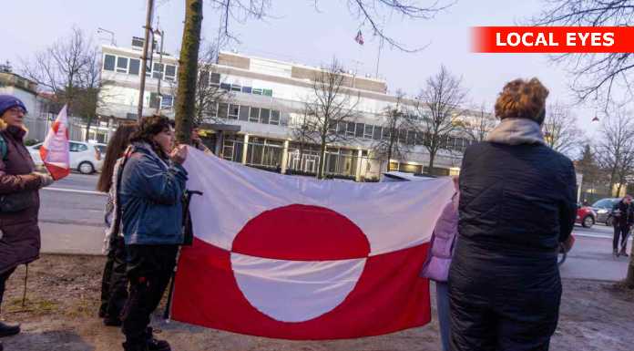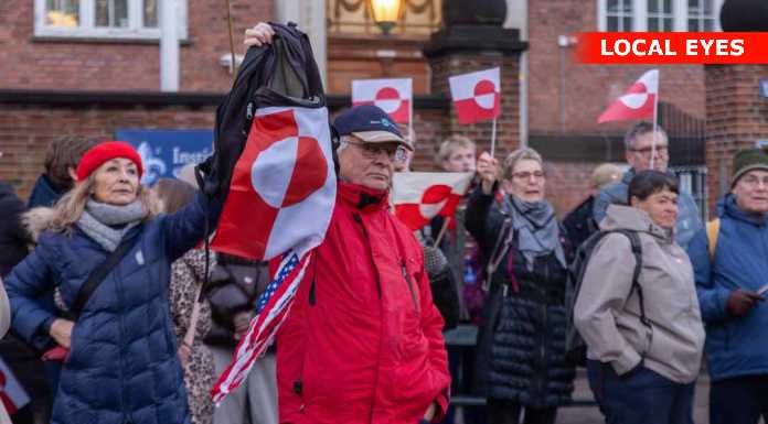 COPENHAGEN: At 4:00 PM, a large crowd gathered in front of the American Embassy in Copenhagen, ahead of the meeting between Danish Foreign Minister Lars Løkke Rasmussen and Greenlandic Vivian Motzfeldt.
