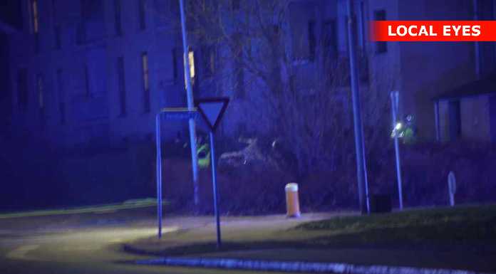 Da fotografen ankom til stedet, var området præget af en massiv politi-afspærring. Store dele af området var lukket af, og der var tydeligt afspærret omkring hændelsesstedet.