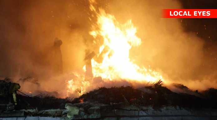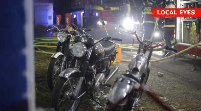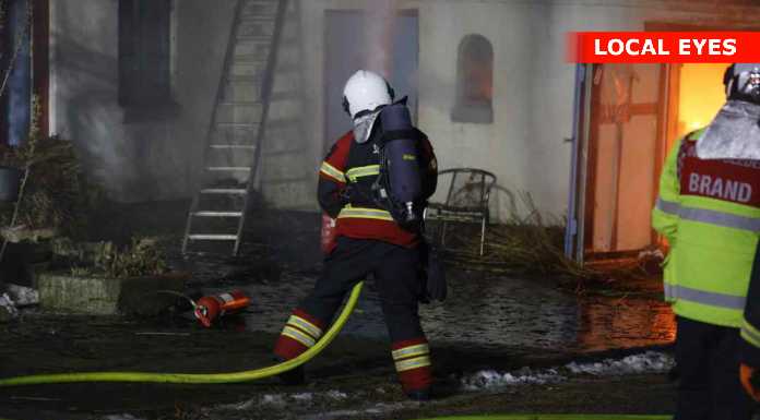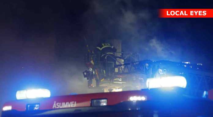 Fotografen på stedet oplevede en bygning, der allerede ved ankomsten var totalt overtændt, med massive flammer og kraftig røgudvikling fra hele ejendommen.