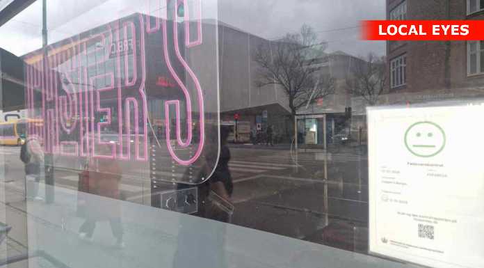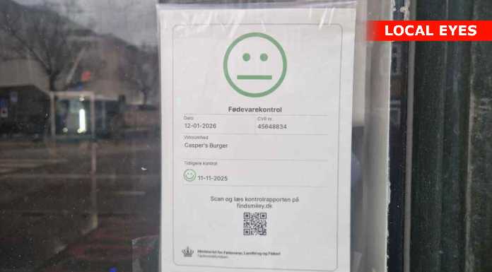 Der hænger samtidig en mellemfornøjet fødevare-smiley i vinduet. Og der er mørkt indenfor.
