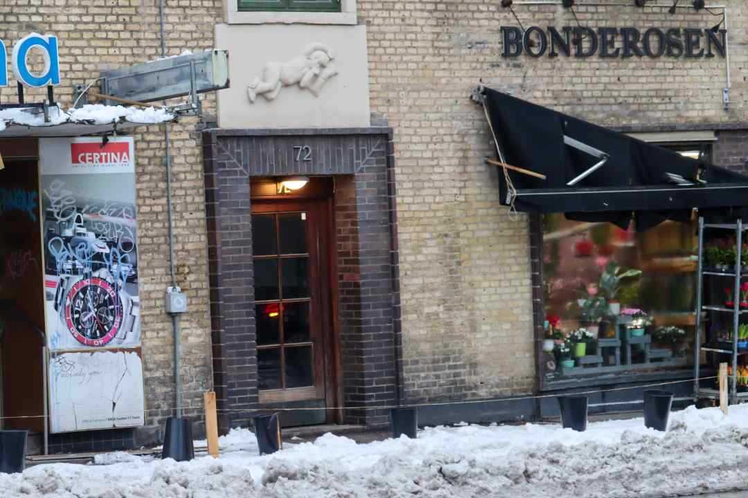 Her ses ødelæggelser efter nedfalden sne og istapper – på Godthåbsvej på Frederiksberg i Københavns politikreds – søndag eftermiddag.