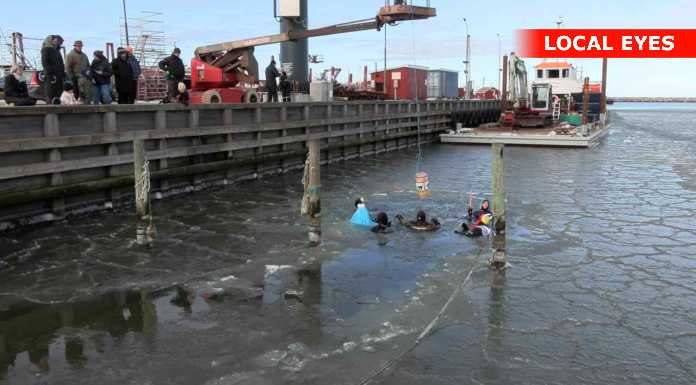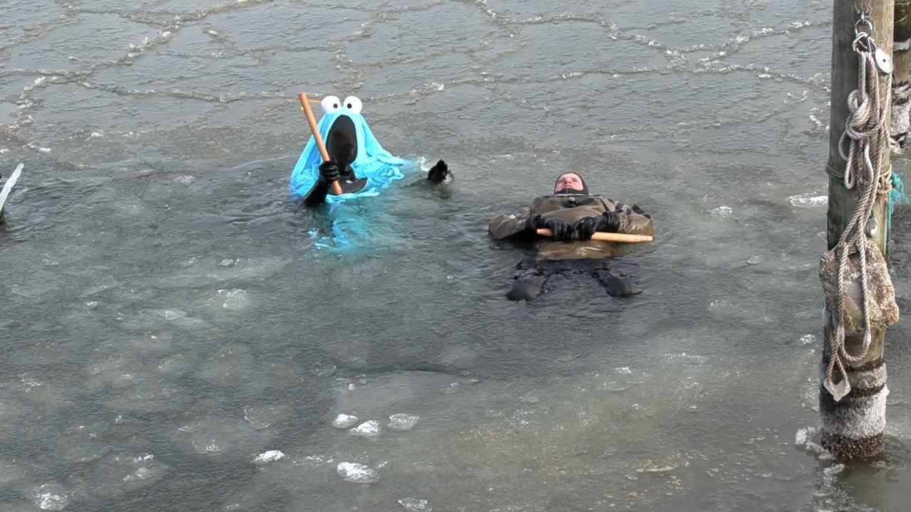 Lørdag eftermiddag kravlede en række sportsdykkere ud på isen i Gilleleje Havn, og fik knækket isen omkring den opsatte tønde ved sejlklubben.