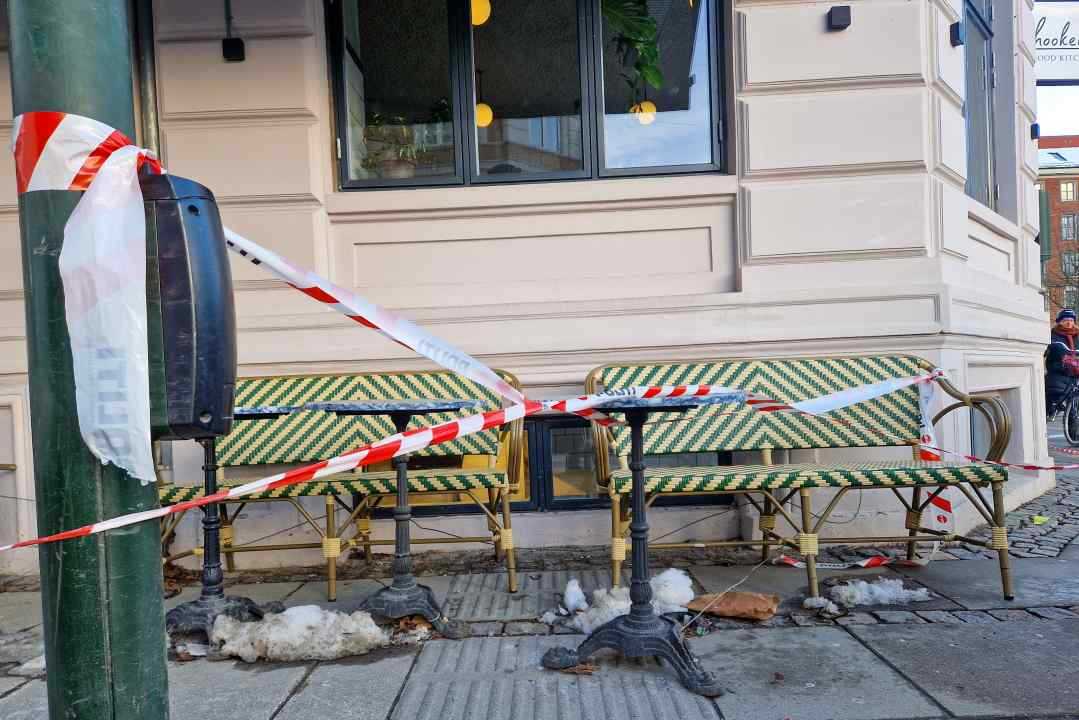 Man har trukket de rød-hvide bånd hen over de tomme caféstole og borde for at sikre, at ingen tager ophold under det tunge snedække. Afspærringen strækker sig langs facaden ud mod lyskrydset, så de bløde trafikanter ledes udenom den potentielle farezone.
