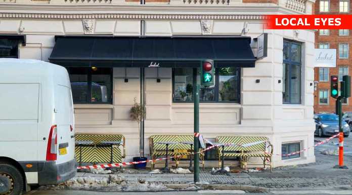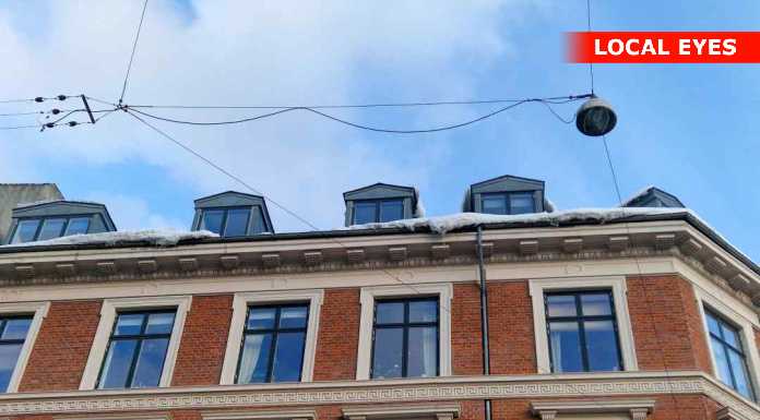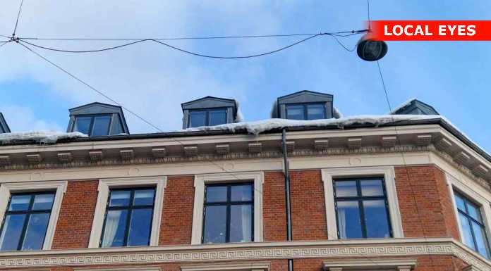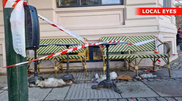 Med de svingende temperaturer er der overhængende fare for, at de massive sne-/isblokke løsner sig og falder direkte ned på fortovet og restaurantens udendørs siddepladser.