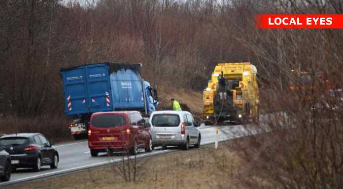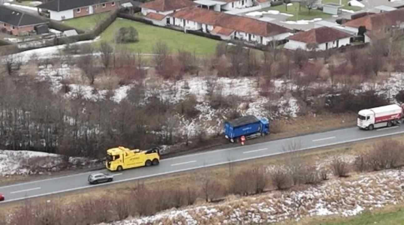Fotografen så lastbilen holde delvist ude i rabatten langs vejen, mens en autohjælpsvogn arbejdede på stedet for at få den trukket op. Trafikken passerede forbi i begge retninger.